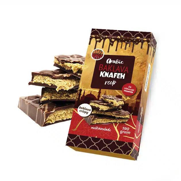 Nieuw! Probeer nu onze Arabic Baklava Knafeh chocoladereep! Deze reep gemaakt van ambachtelijke melkchocolade gevuld met verse baklava en crispy knafeh, zorgt voor een unieke en luxe smaak. De chocoladereep is perfect als geschenk voor liefhebbers van oosterse zoetigheden of om jezelf mee te verwennen! Wie verwen jij?