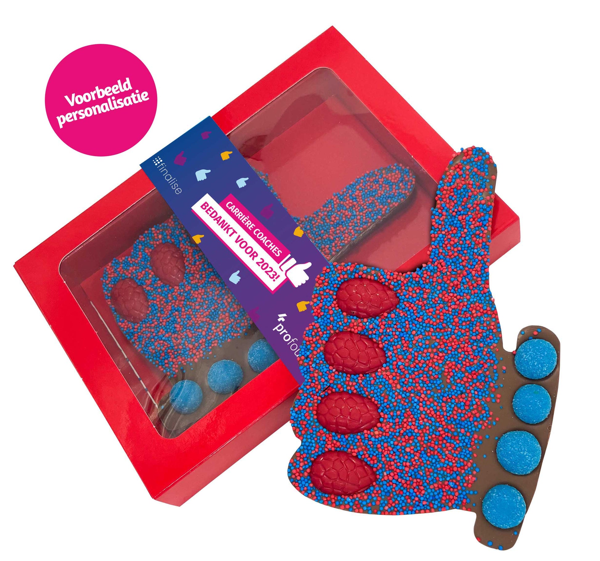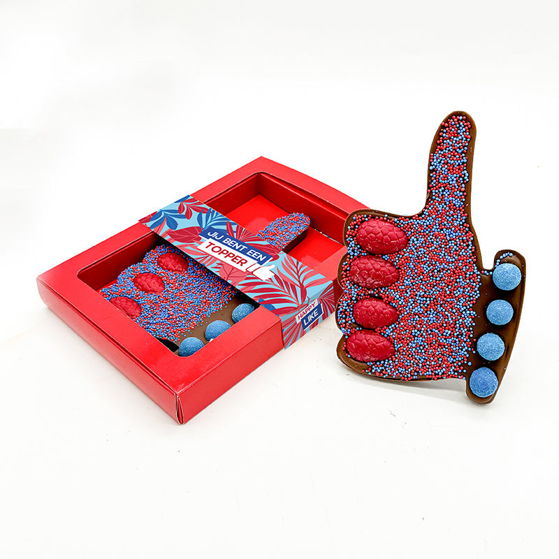 Vaak steek je je duim omhoog om iets positiefs te gebaren. Dit kun je nu ook via onze lekkere chocolade laten blijken aan een ander. Maak kennis met onze vernieuwde chocoladetablet met crunchy kleurenballen en ‘discodip’ sprinkels: de “Jij bent een topper” editie (190g). Deze chocolade duim is super om te geven als cadeau! Laat iemand weten dat ze positief in je leven staan.