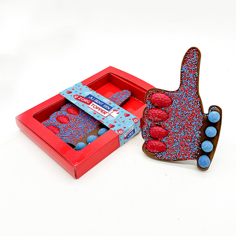 Vaak steek je je duim omhoog om iets positiefs te gebaren. Dit kun je nu ook via onze lekkere chocolade laten blijken aan een ander. Maak kennis met onze vernieuwde chocoladetablet met crunchy kleurenballen en ‘discodip’ sprinkels: de “Jij bent een zorg topper” editie (190g). Deze chocolade duim is super om te geven als cadeau! Laat iemand weten dat ze positief in je leven staan.