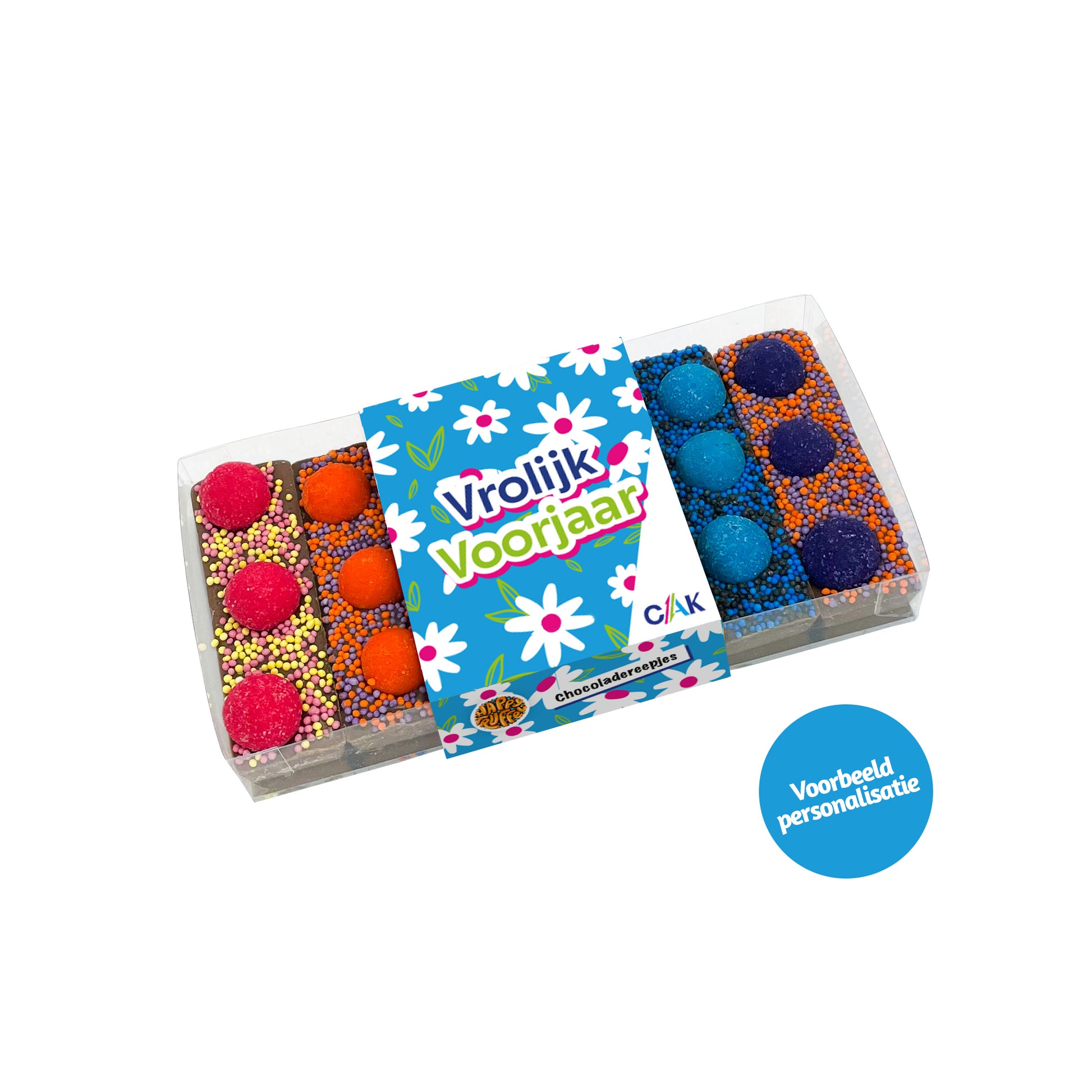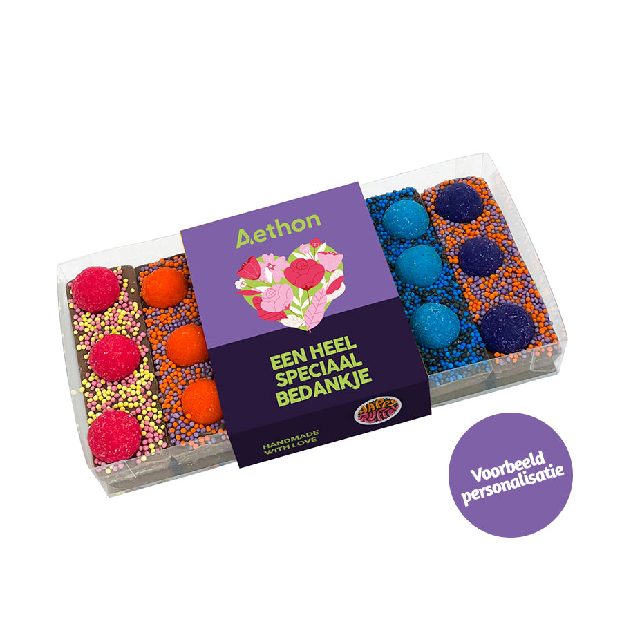 HappyBar. Een kleurrijke chocoladereep met musketzaden en vrolijke crispyballen. Proef de heerlijke melkchocolade versterkt met een luchtige bite. Deze speciale Proeverij heeft de 6 verschillende smaken (Hazelnoot - Karamel-Zeezout - Framboos/Yoghurt - Koffie - Cookie - Kokos).