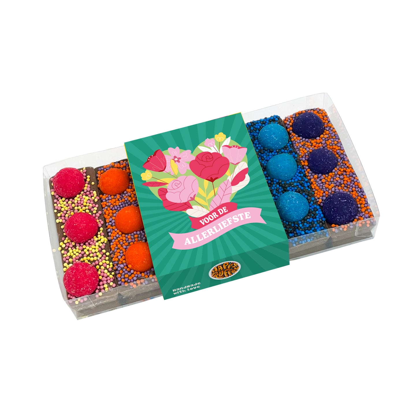 Verras een “Allerliefste” met deze liefde versie van de chocoladereepjes proeverij. Bestaande uit de 6 smaken van onze Proeverij: Framboos/Yoghurt, Cookie, Hazelnoot, Caramel-Zeezout, Kokos en Koffie.