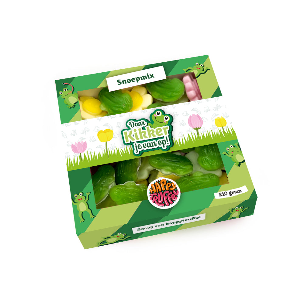 Een lekker doosje snoep om iemand beterschap te wensen. De editie "Daar Kikker je van op!" is een combinatie van kikkertjes-snoep en bloemetjes-snoep. Daar kun je veel mensen mee opbeuren en een glimlach geven in een mindere periode.